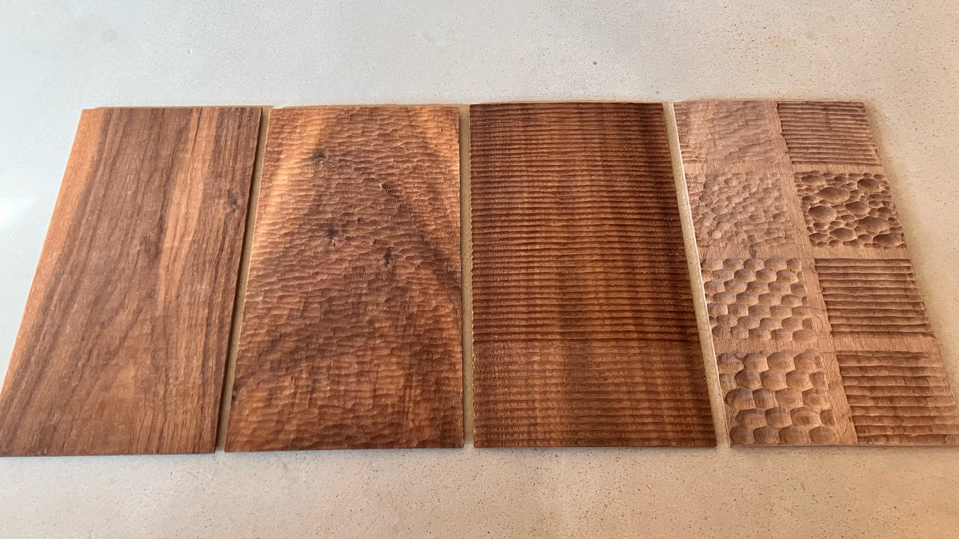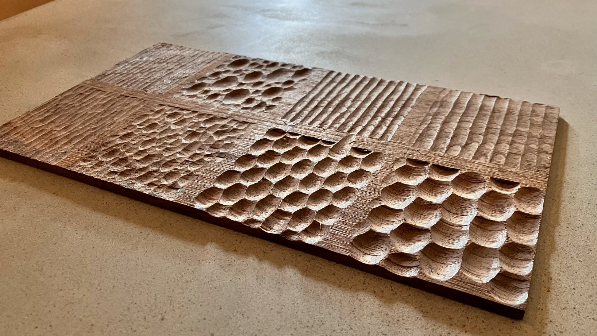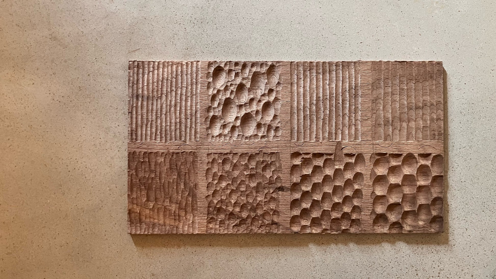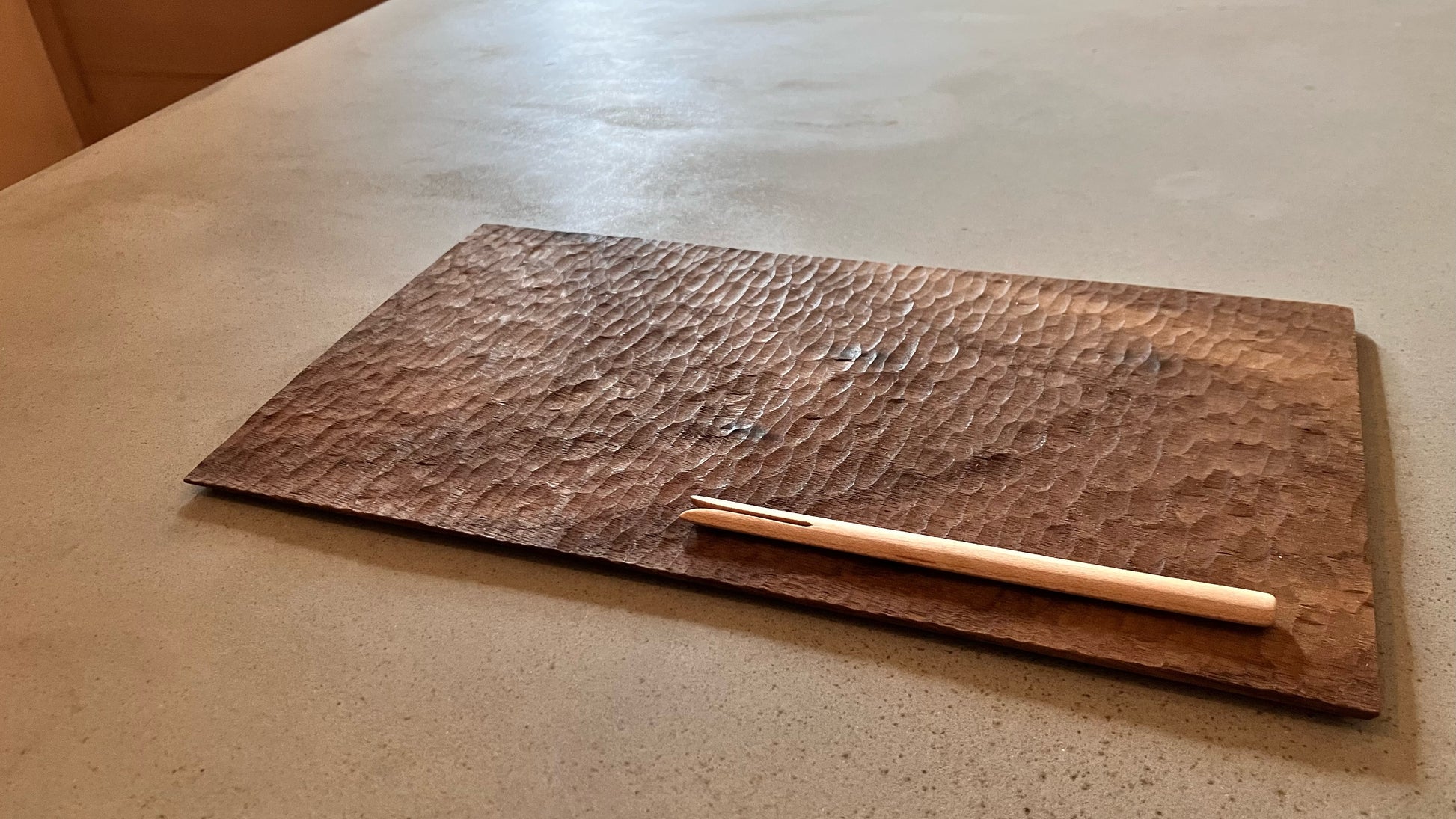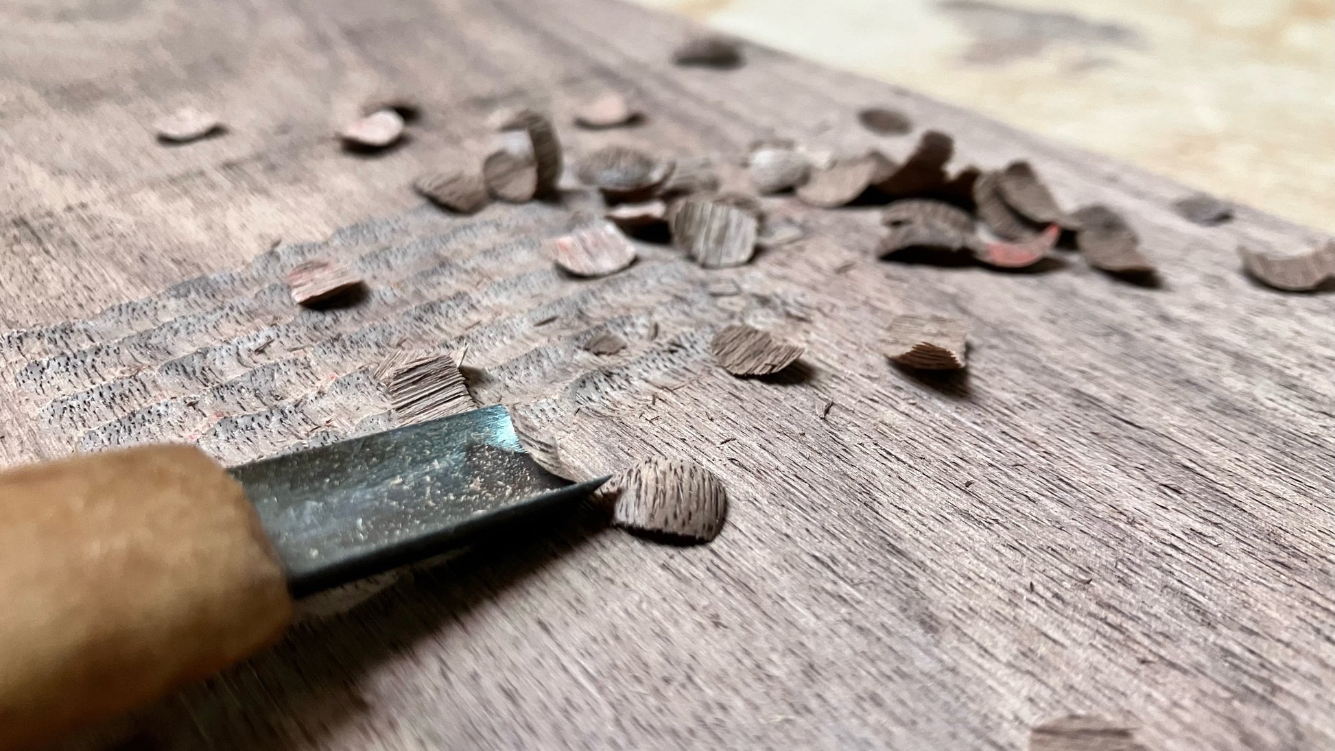 このワークショップの醍醐味は、ウォールナットの薄い板に彫刻刀で自由に彫り目をつけていくことです。石目彫りや亀甲彫りなどにとらわれず、「自分がいいように」、無心に、そして匠の気持ちで彫り進めていただきます。正解も失敗もありません。ただ、ご自身の感性に従って、オリジナルの表情を作り上げてください。