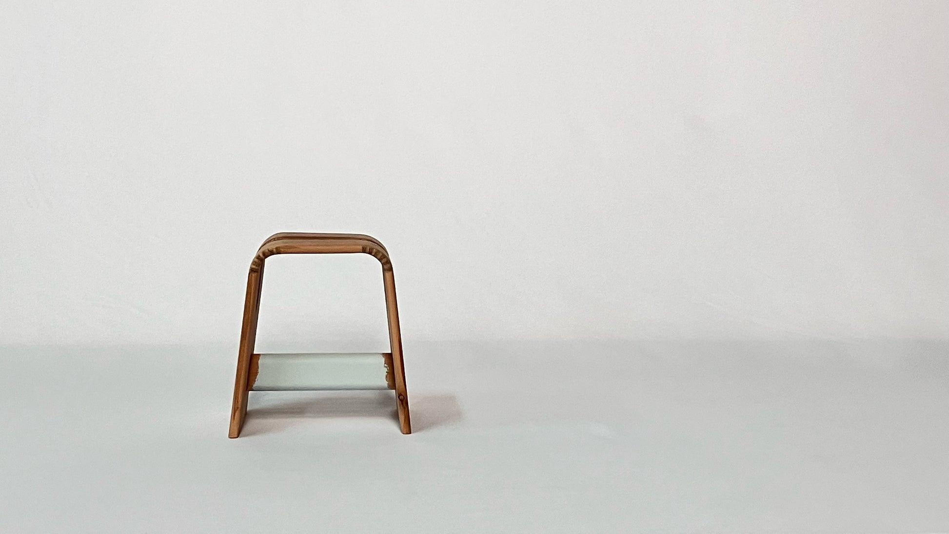 当工房の代表作であるオーク材のスツールの原点となった、10mmの薄い杉板を曲げて作った小さく、そして非常に軽量なスツールです。