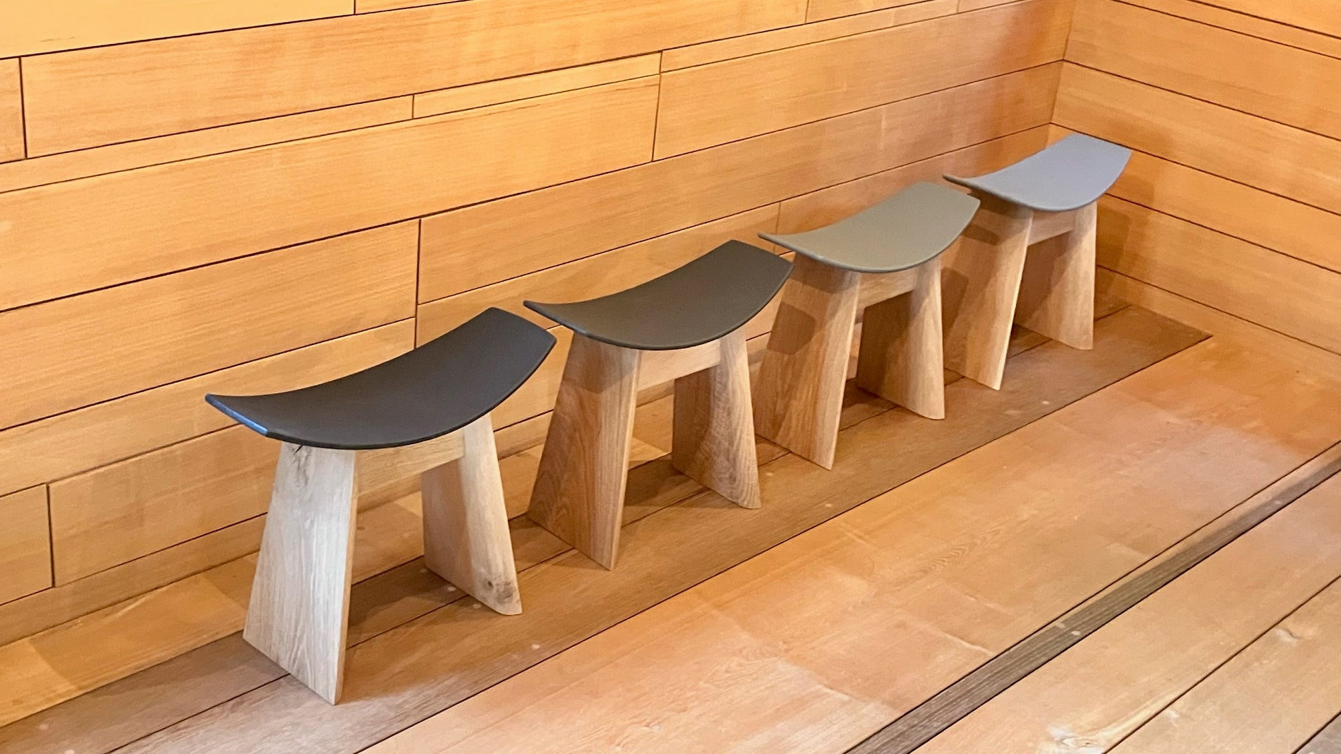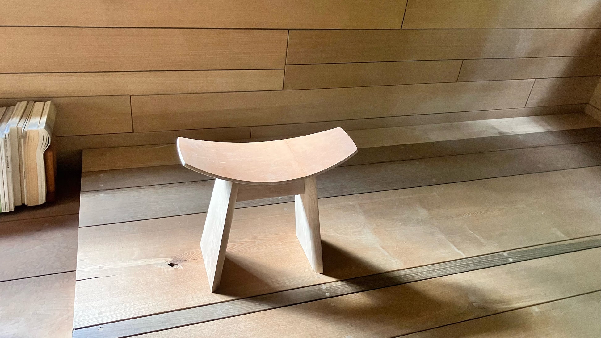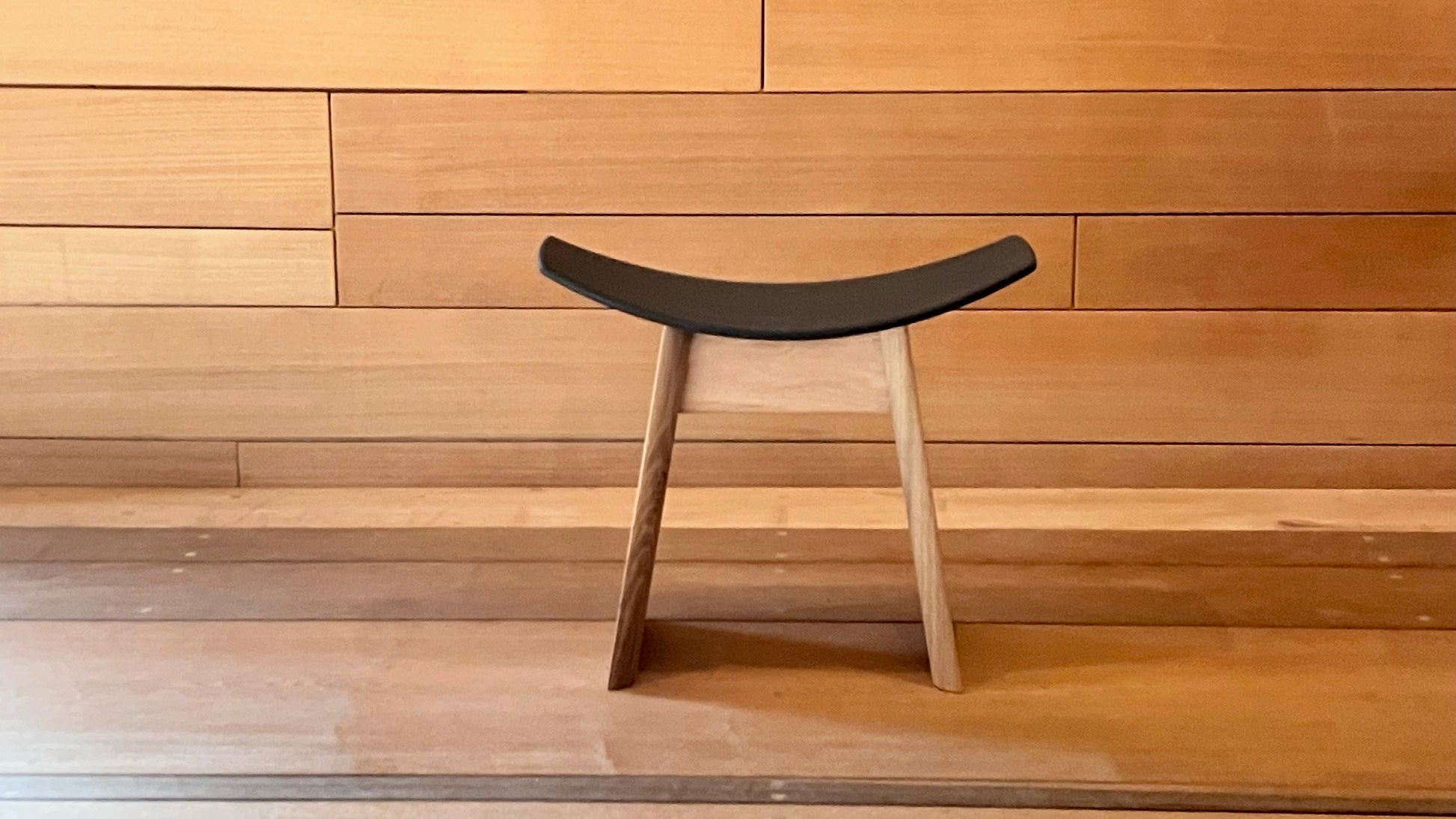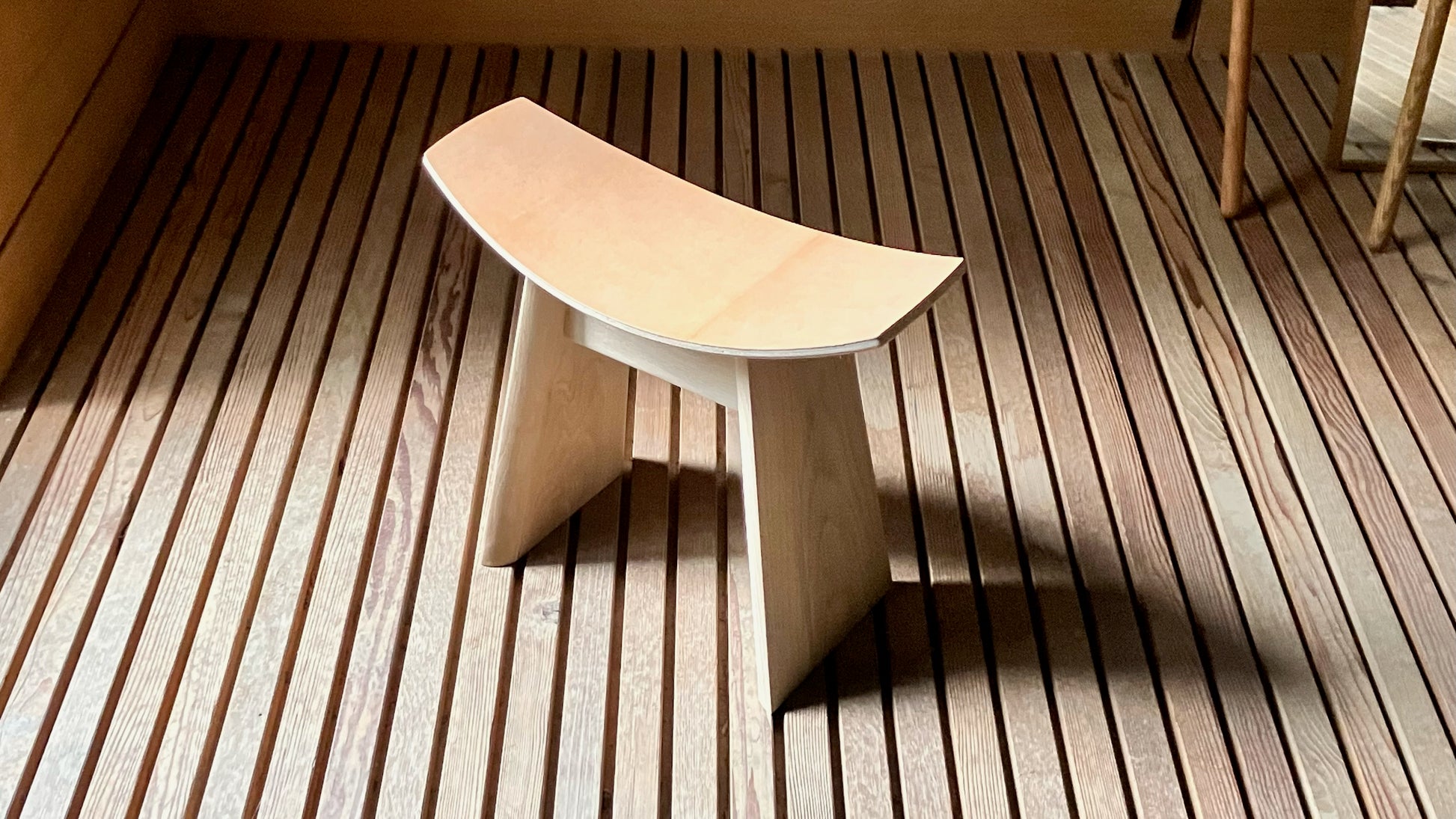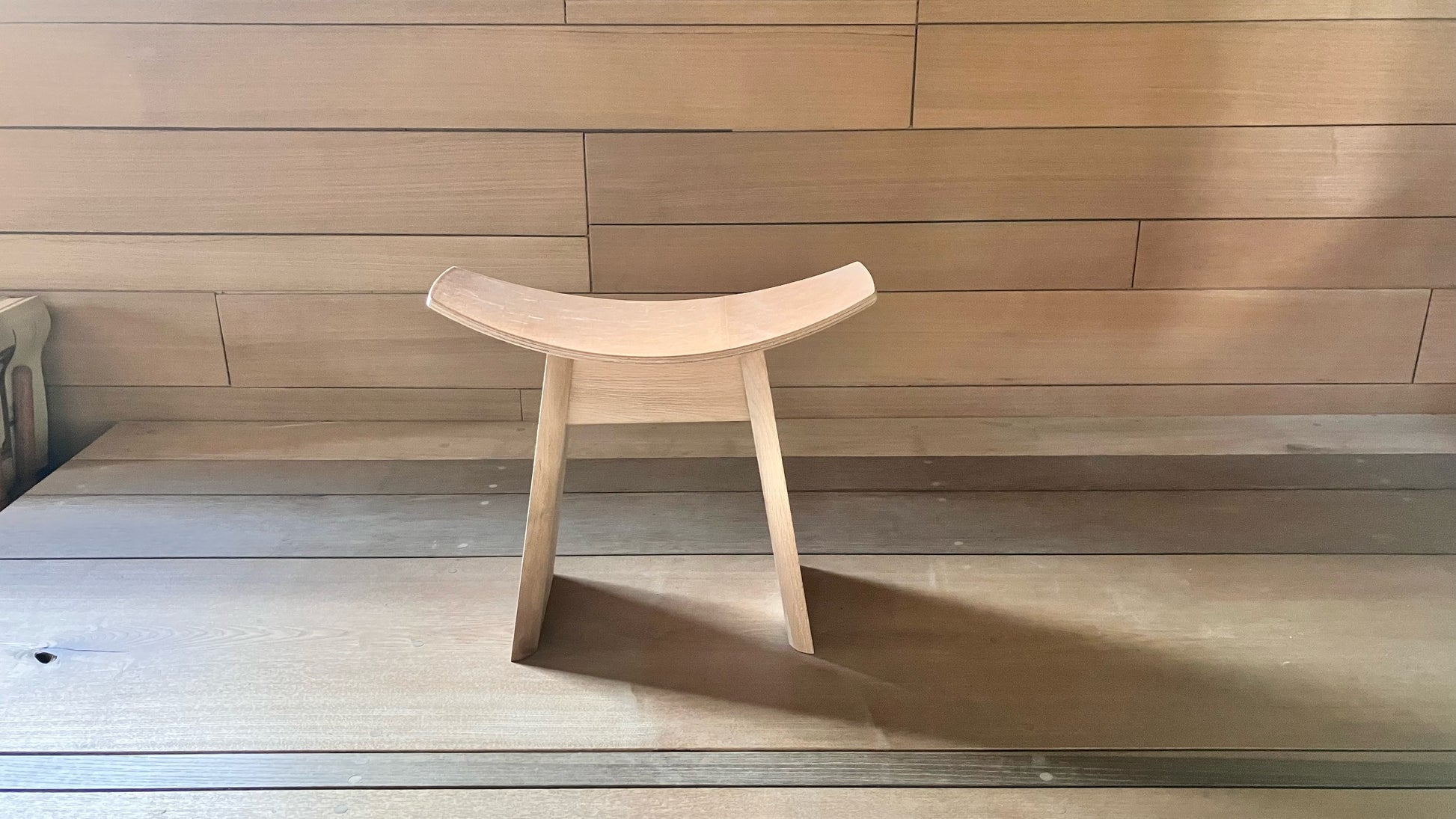 当工房オリジナルイージーチェアの背板製作で余った曲げ合板の端材を座面に活用しました。通常の座面サイズには満たないため奥行きは狭くなりますが(D210mm)、500Rというきつめの曲げが、ちょっとした腰掛けに最適な座り心地を生み出しました。