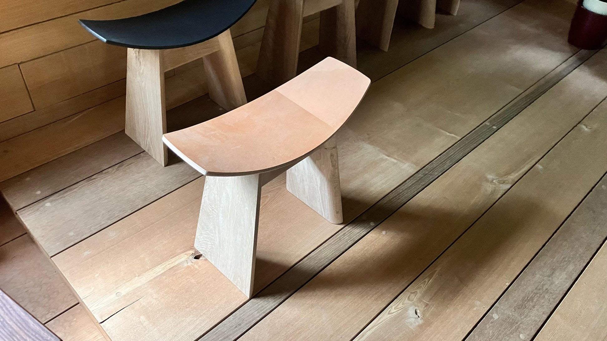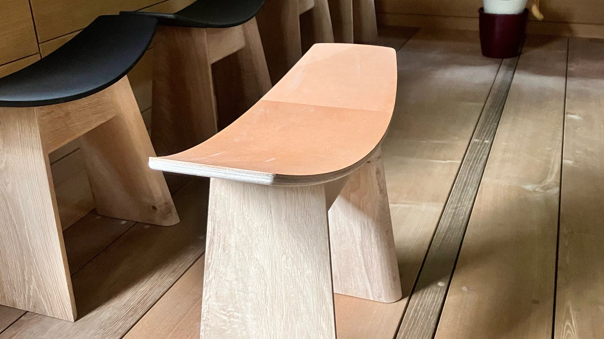 「DIYシリーズ」の第二弾として、曲げ合板の座面とオーク材の脚を組み合わせた細長スツールが誕生しました。